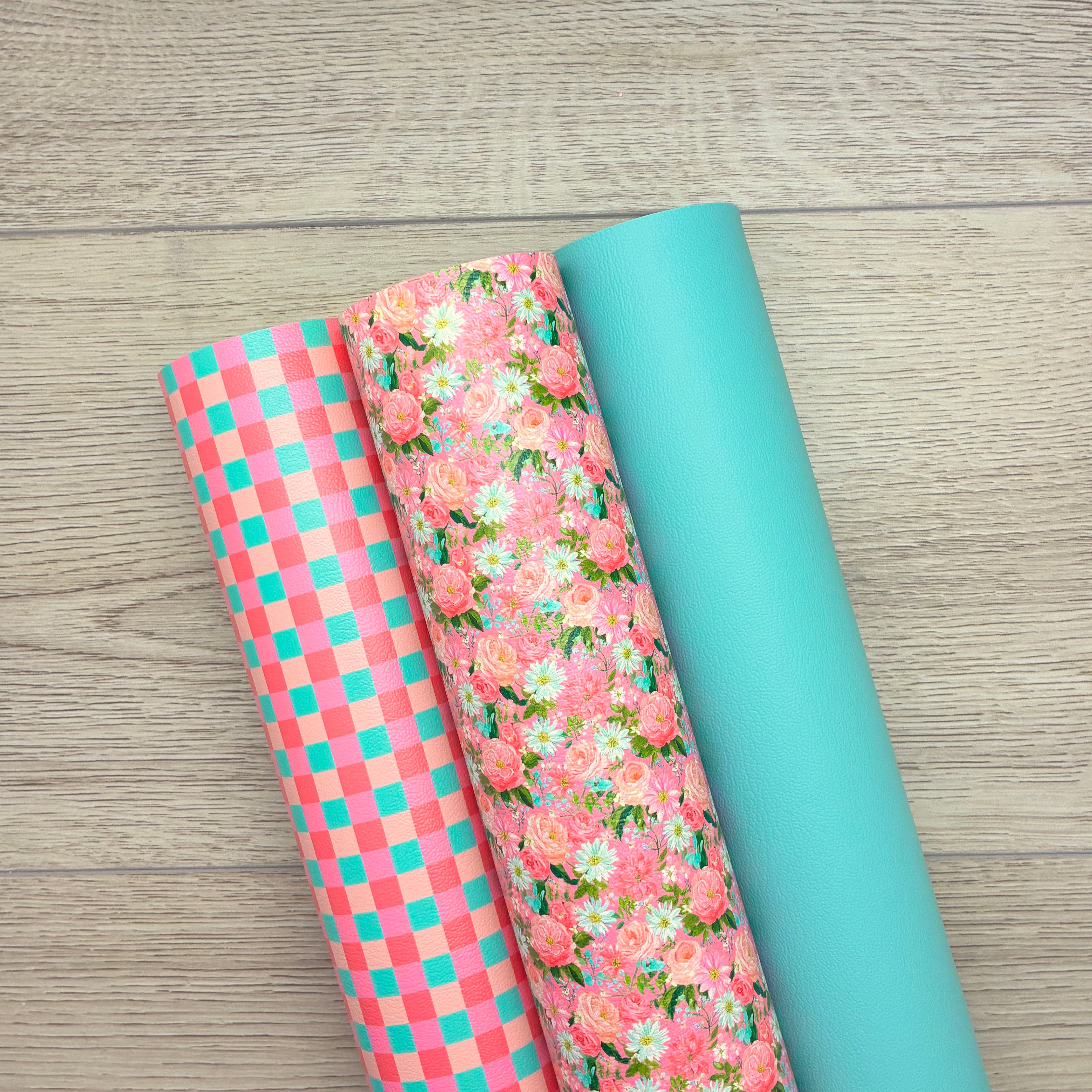 Preppy Painted Pink Floral, Checkers, California Breeze Solid