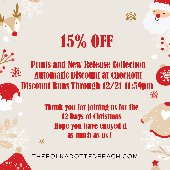 Today's surprise for our final day of the 12 Days of Christmas is 15% Off Prints and New Release. Discount automatic at checkout. Sale will run through 12/21 at 11:59 pm CST.